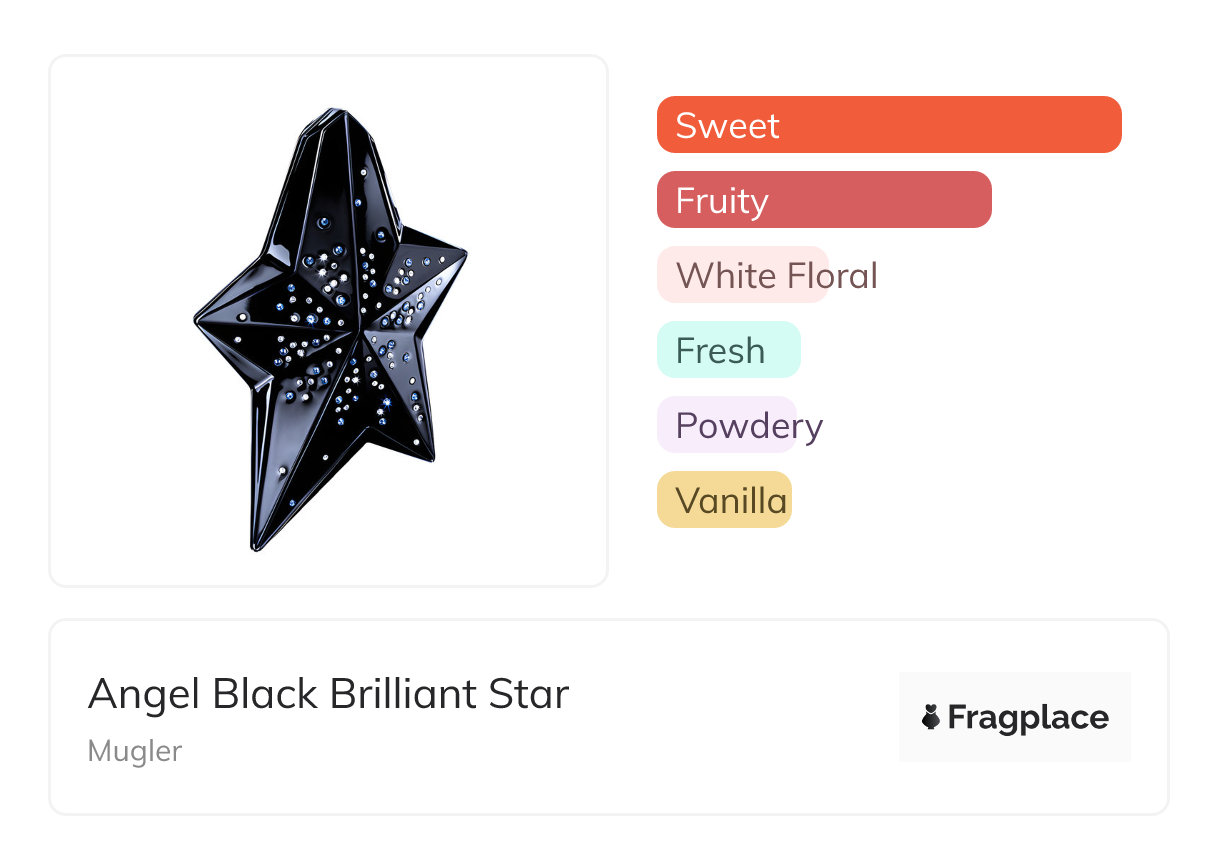 Angel Black Brilliant Star, de Mugler a été lancé en 2013. Le parfumeur derrière cette création est inconnu. Il a les notes de tête de Bergamote, Noix de coco, Barbe à papa, Feuille et bourgeon de groseille, Jasmin, Orange Mandarine, and Melon, notes de cœur de Abricot, Blackberry, Miel, Jasmin, Muguet, Orchidée, Pêche, Prune, Baies rouges, and Rose, and notes de fond de Ambre, Caramel, Chocolat noir, Musk, Patchouli, Fève de Tonka, and Vanille.