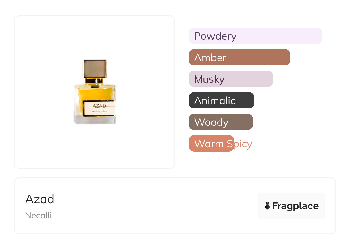Necalli से Azad 2023 में रिलीज़ हुआ था। इस रचना के पीछे इत्र निर्माता Flavius Calaj हैं। इसमें Cardamom, Liquor, and Maraschino Cherry के टॉप नोट्स, Amber, Heliotrope, and Violet के मिडिल नोट्स, and Ambergris, Cashmeran, Dry Wood, Leather, and Musk के बेस नोट्स हैं।