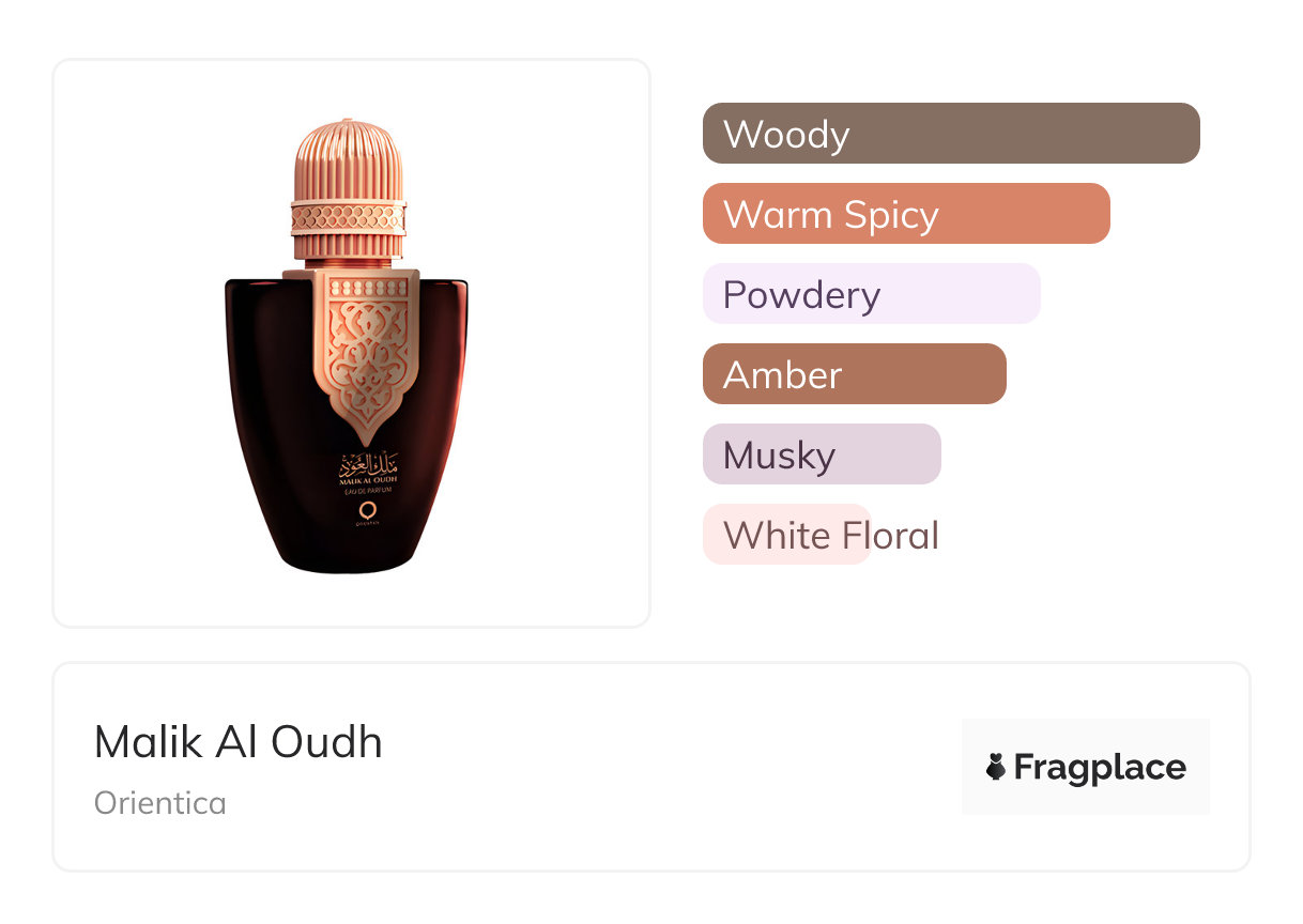 Orientica से Malik Al Oudh 2018 में रिलीज़ हुआ था। इस रचना के पीछे इत्र निर्माता अज्ञात हैं। इसमें Bergamot, Cedarwood, and Saffron के टॉप नोट्स, Cedarwood, Jasmine, and Musk के मिडिल नोट्स, and Amber, Oriental Notes, Sandalwood, and Vanilla के बेस नोट्स हैं।