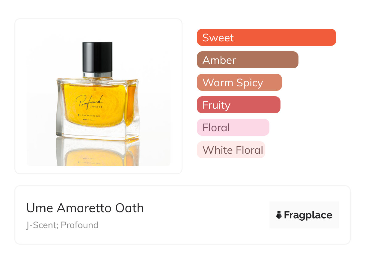 J-Scent; Profound से Ume Amaretto Oath 2022 में रिलीज़ हुआ था। इस रचना के पीछे इत्र निर्माता अज्ञात हैं। इसमें Amaretto, Orange, Plum, and Shiso के टॉप नोट्स, Jasmine, Mimosa, and Rose के मिडिल नोट्स, and Ambergris, Dark Chocolate, Labdanum, and Patchouli के बेस नोट्स हैं।