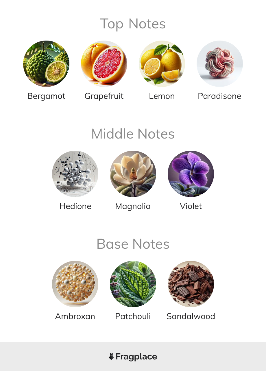Moudon से Eclipse 2022 में रिलीज़ हुआ था। इस रचना के पीछे इत्र निर्माता अज्ञात हैं। इसमें Bergamot, Grapefruit, Lemon, and Paradisone के टॉप नोट्स, Hedione, Magnolia, and Violet के मिडिल नोट्स, and Ambroxan, Patchouli, and Sandalwood के बेस नोट्स हैं।