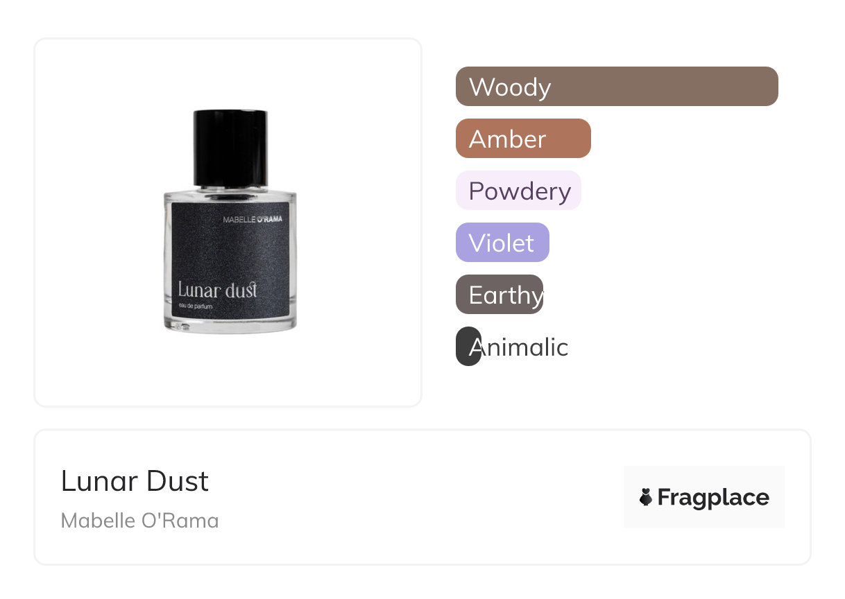 Lunar Dust, di Mabelle O'Rama è stato rilasciato nel 2022. Il profumiere di questa creazione è Mabelle O'Rama. Le note sono Ambra, Legno di cedro, Iris, Note legnose.