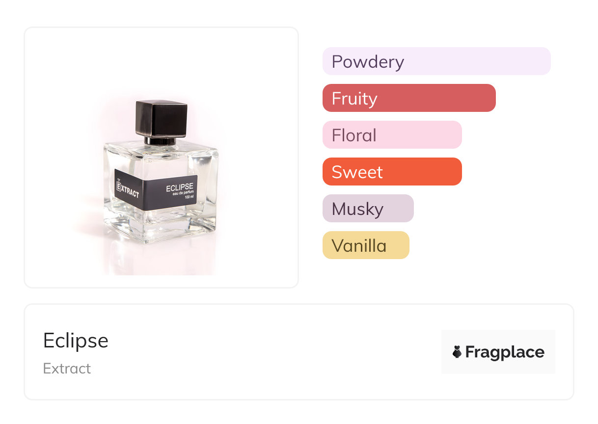 Eclipse, di Extract è stato rilasciato nel 2022. Il profumiere di questa creazione è sconosciuto. Ha le note di testa di Mandorla, Pompelmo della passione, and Fiori di pesco, note di cuore di Viola, and note di fondo di Latte, Muschio, Sandalo, and Vaniglia.