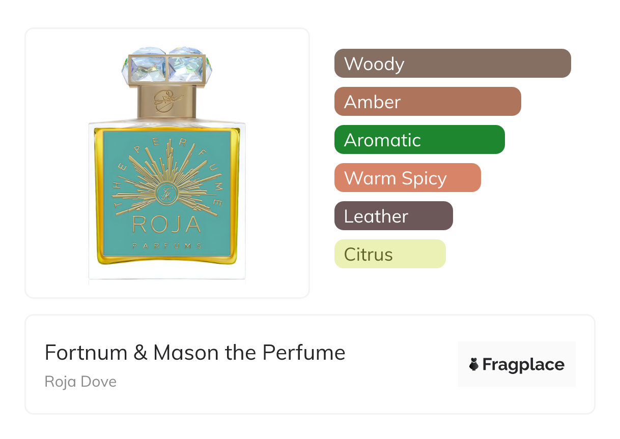 Fortnum & Mason the Perfume, di Roja Dove è stato rilasciato nel 2018. Il profumiere di questa creazione è Roja Dove. Ha le note di testa di Bergamotto and Limone, note di cuore di Geranio, Gelsomino, Labdano, Fiori d'arancio, Pesca, and Rosa, and note di fondo di Ambra, Amyris, Benzoino, Betulla, Castoreo, Coriandolo, Labdano, Muschio, Muschio di quercia, Olibano (incenso), Patchouli, Zafferano, Sandalo, Vaniglia, and Vetiver.