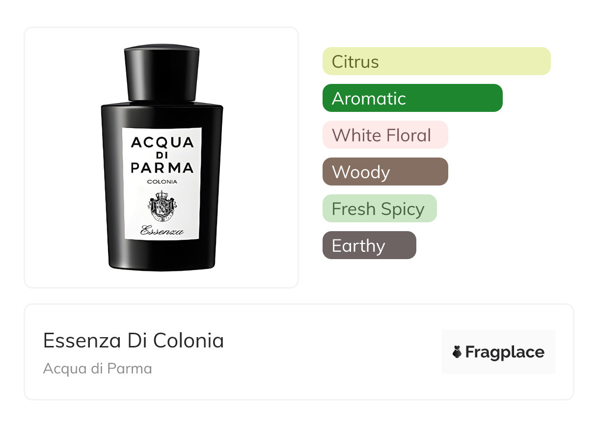 Essenza Di Colonia, di Acqua di Parma è stato rilasciato nel 2010. Il profumiere di questa creazione è sconosciuto. Le note sono Ambra, Bergamotto, Chiodi di garofano, Pompelmo, Gelsomino, Il giglio della valle, Arancia mandarino, Muschio, Neroli, Muschio di quercia, Arancione, Patchouli, Petitgrain, Rosa, Rosmarino, Salvia, Vetiver.