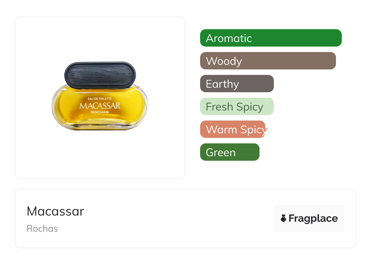 Macassar, di Rochas è stato rilasciato nel 1980. Il profumiere di questa creazione è Nicolas Mamounas and Roger Pellegrino. Ha le note di testa di Artemisia, Bergamotto, Note fruttate, Note verdi, and Albero di pino, note di cuore di Garofano, Legno di cedro, Geranio, Gelsomino, Patchouli, and Vetiver, and note di fondo di Ambra, Noce di cocco, Pelle, Muschio, and Muschio di quercia.