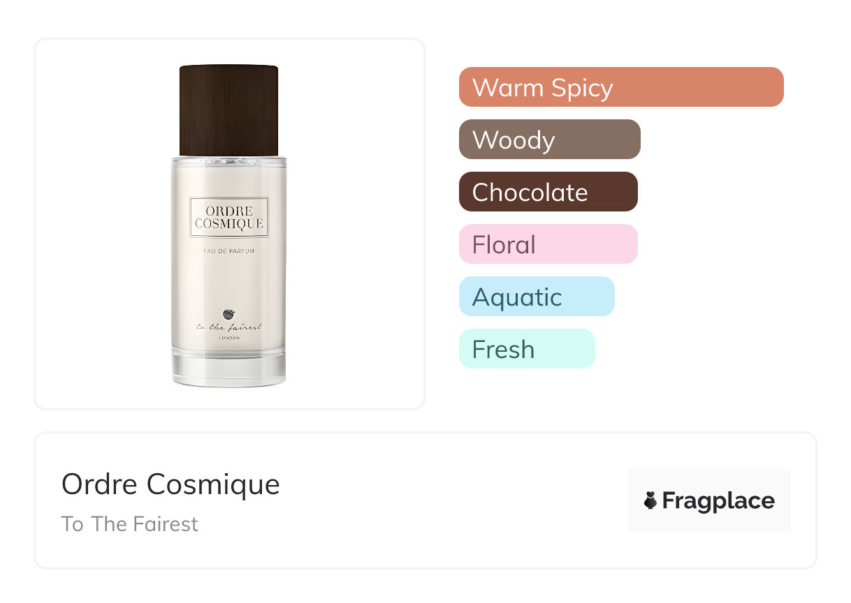 Ordre Cosmique, di To The Fairest è stato rilasciato nel 2021. Il profumiere di questa creazione è sconosciuto. Ha le note di testa di Cardamomo, note di cuore di Ninfea, and note di fondo di Legno di cedro and Cioccolato fondente.