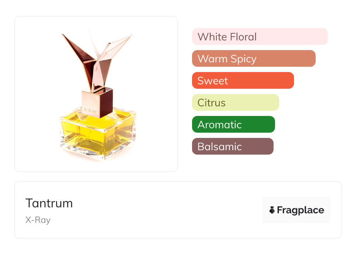 Tantrum, di X-Ray è stato rilasciato nel 2013. Il profumiere di questa creazione è sconosciuto. Ha le note di testa di Bergamotto, Cannella, Galbano, Lavanda, Neroli, and Foglia di violetta, note di cuore di Gelsomino, Fiori d'arancio, Rosa, Ginestra spagnola, and Tuberosa, and note di fondo di Immortale, Mirra, Muschio di quercia, Patchouli, and Balsamo di Tolu.
