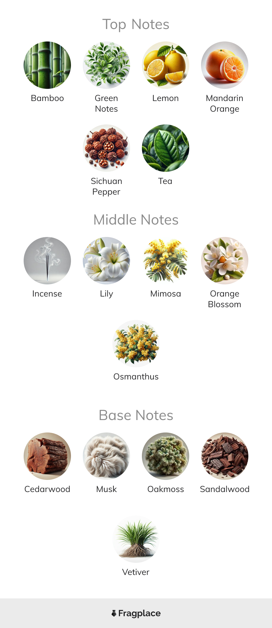 Panda inizia con un intenso accordo di verde rugiada e accenni di calore pepato, seguito da fiori d'arancio e gigli, per arrivare infine a radici terrose e muschi umidi. Non si tratta tanto di un panda roly-poly, quanto piuttosto di una cronaca del suo lento passeggiare tra sorgenti di montagna e boschetti di bambù, sgranocchiando gambi e foglie e vivendo in pratica uno stile di vita da panda molto low-key, low-stress e sereno. Molto più tardi si avverte un lieve sentore di legno di sandalo; forse l'ultima tappa del suo viaggio è un tempio in ombra al tramonto, per accendere un bastoncino d'incenso e ringraziare gli dei per la sua buona sorte.