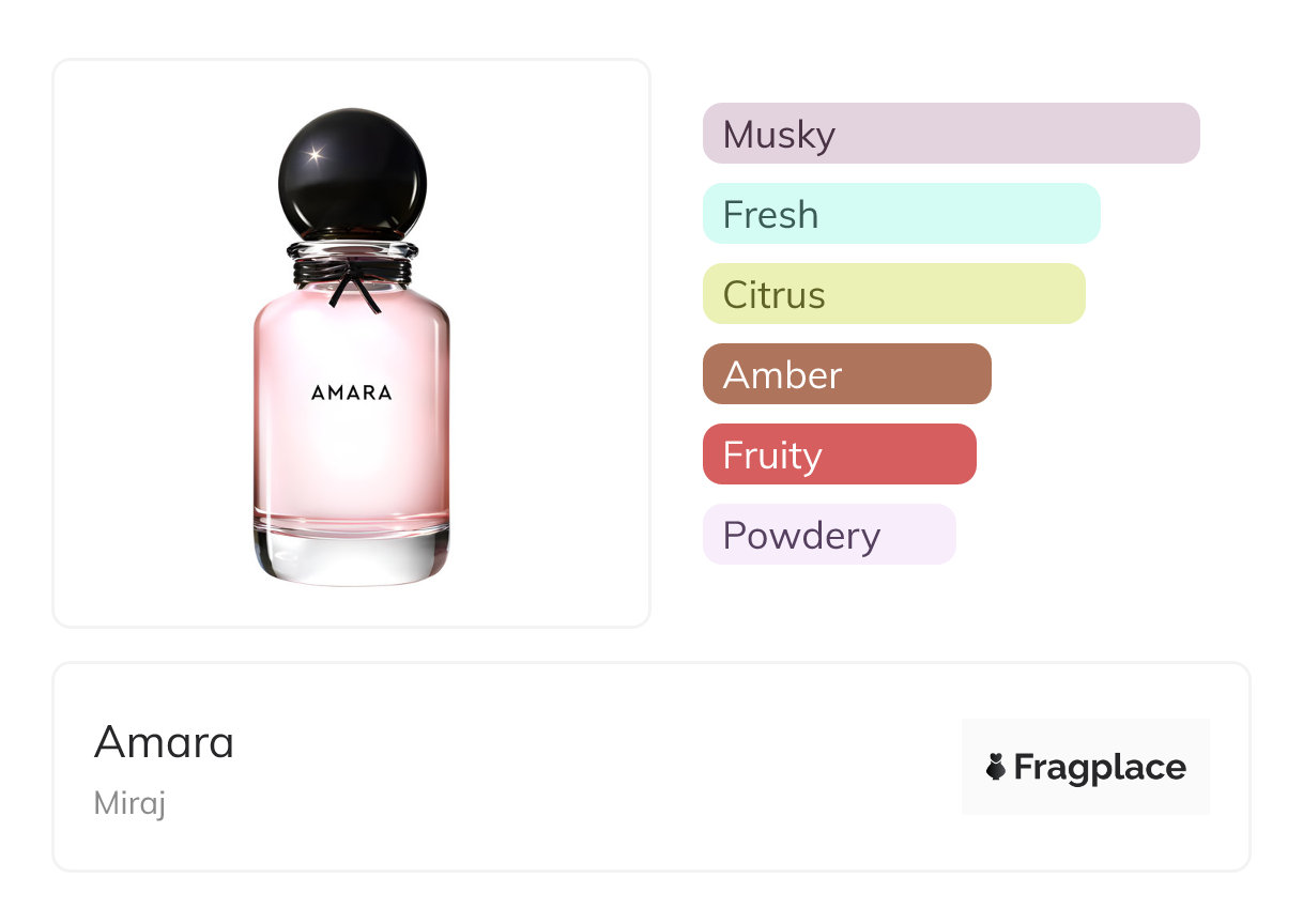 Amara, di Miraj è stato rilasciato nel 2024. Il profumiere di questa creazione è Paolo Cerizza. Ha le note di testa di Bergamotto, Arancia amara, and Ribes rosso, note di cuore di Ciliegia nera, Fiori di ciliegio, Polvere, and Tuberosa, and note di fondo di Ambroxan, Cashmeran, and Muschio.