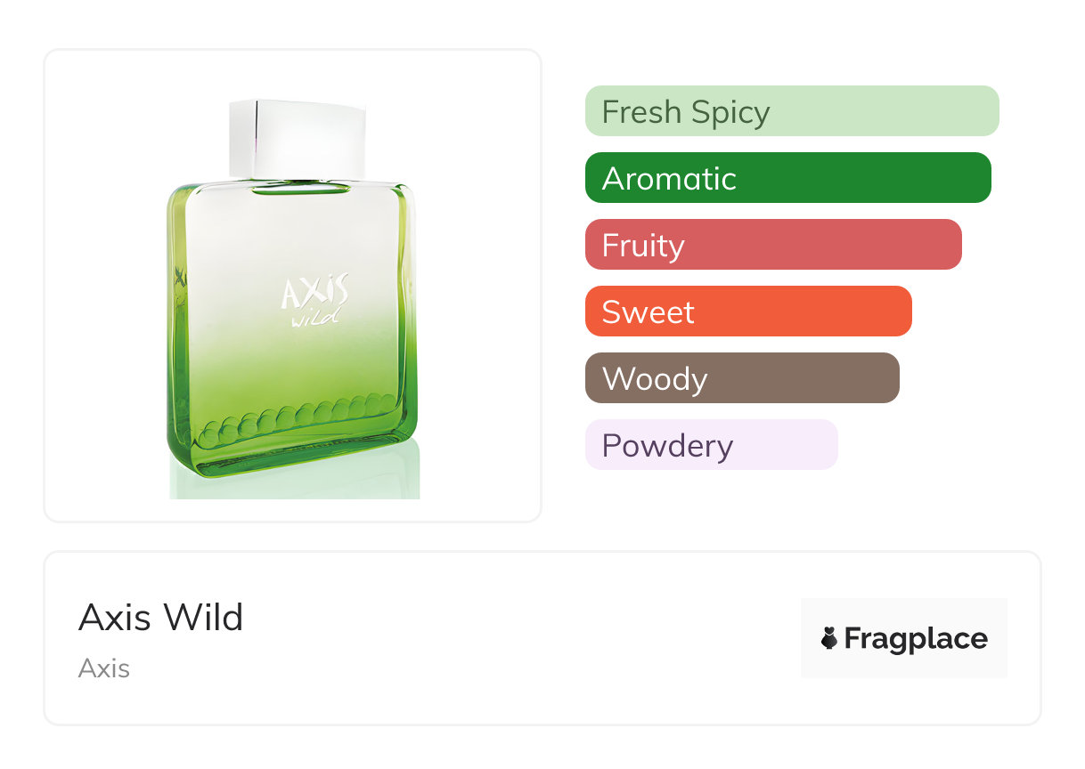 Axis Wild, di Axis è stato rilasciato in anno sconosciuto. Il profumiere di questa creazione è sconosciuto. Ha le note di testa di Bergamotto, Note verdi, and Pera, note di cuore di Lavanda, Pepe, Ananas, and Salvia, and note di fondo di Ambra grigia, Muschio, Muschio di quercia, and Sandalo.