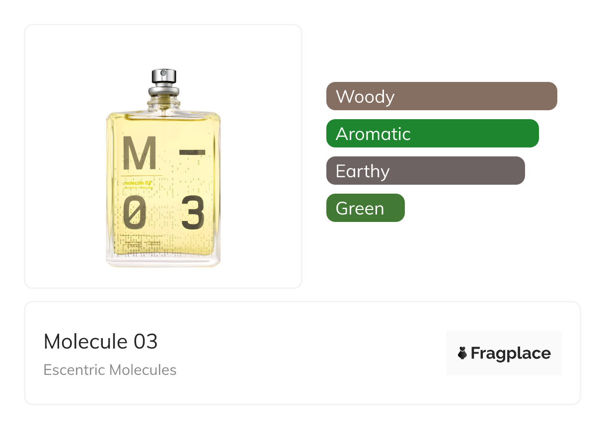 Molecule 03, di Escentric Molecules è stato rilasciato nel 2010. Il profumiere di questa creazione è Geza Schoen. Le note sono Vetiver.