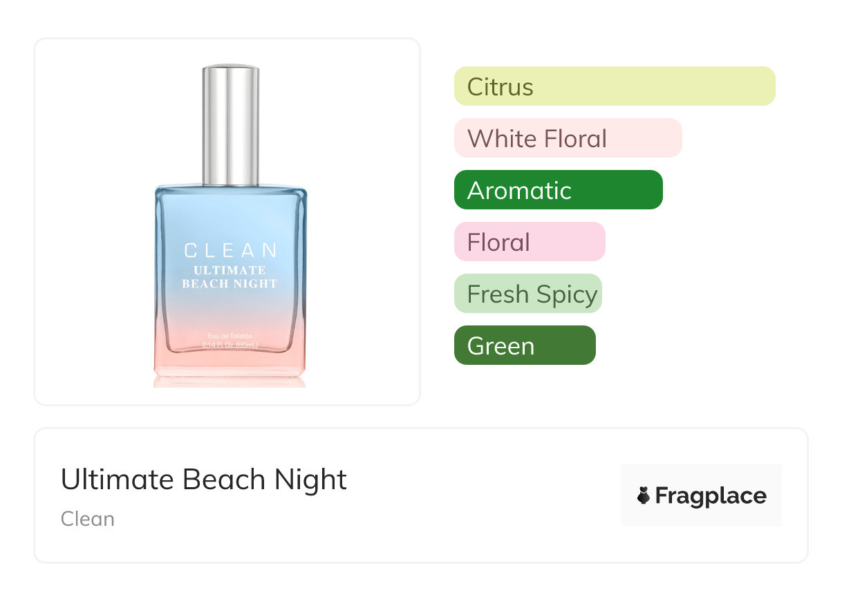 Ultimate Beach Night, di Clean è stato rilasciato nel 2018. Il profumiere di questa creazione è sconosciuto. Ha le note di testa di Bergamotto, Limone, Arancione, and Acqua di mare, note di cuore di Bougainvillea, Lavanda, Lilla, Neroli, Gelsomino notturno, Tuberosa, and Foglia di violetta, and note di fondo di Ambra grigia, Legno d'albero, and Muschio.