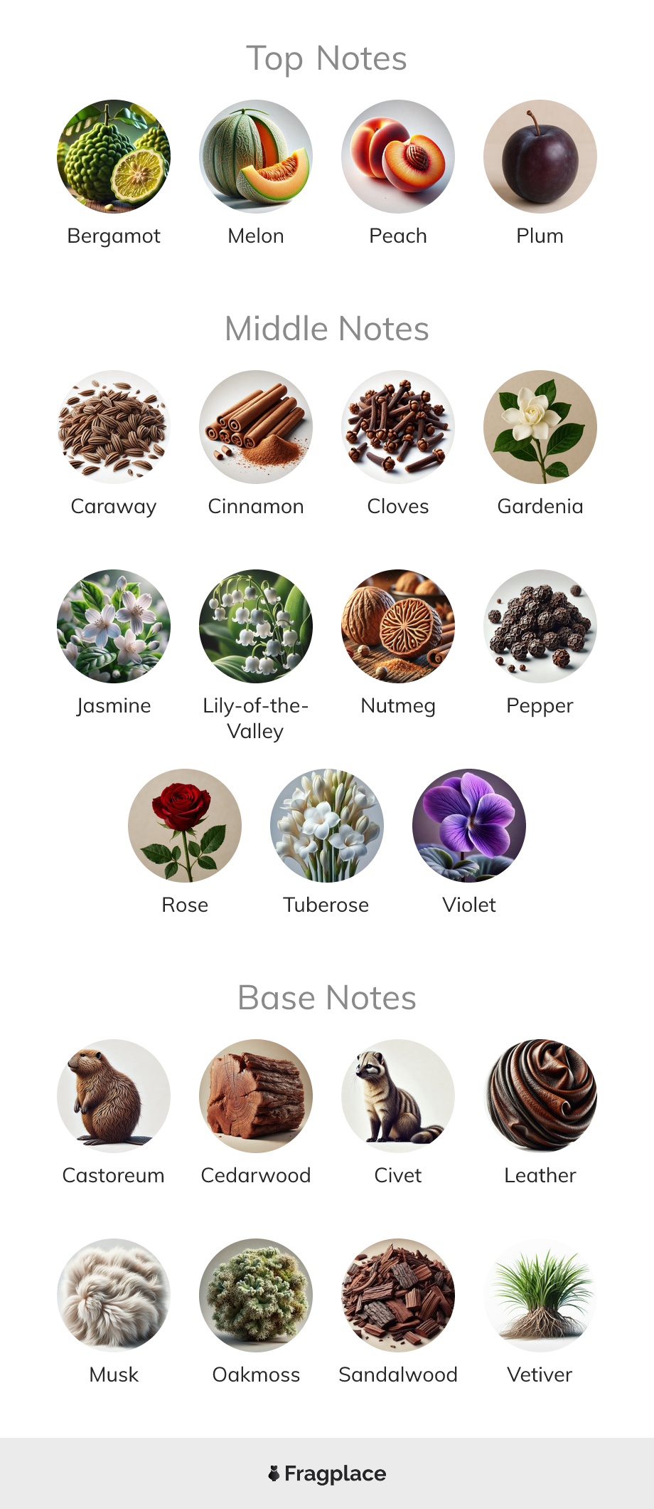 Diorama, di Dior è stato rilasciato nel 1948. Il profumiere di questa creazione è Edmond Roudnitska. Ha le note di testa di Bergamotto, Melone, Pesca, and Prugna, note di cuore di Caraway, Cannella, Chiodi di garofano, Gardenia, Gelsomino, Il giglio della valle, Noce moscata, Pepe, Rosa, Tuberosa, and Viola, and note di fondo di Castoreo, Legno di cedro, Civet, Pelle, Muschio, Muschio di quercia, Sandalo, and Vetiver.