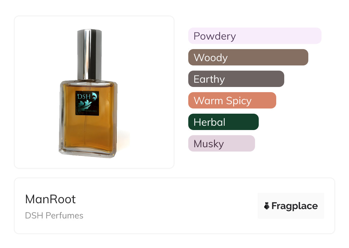 ManRoot, di DSH Perfumes è stato rilasciato nel 2020. Il profumiere di questa creazione è Dawn Spencer Hurwitz. Le note sono Ambra grigia, Ambretta (Malva muschiata), Angelica, Bergamotto, Carota, Costus, Curcuma (Curcumina), Ginseng, Immortale, Iris, Gelsomino, Radice di Orris, Pepe, Rosa, Sandalo, Vetiver, Viola, Note legnose.