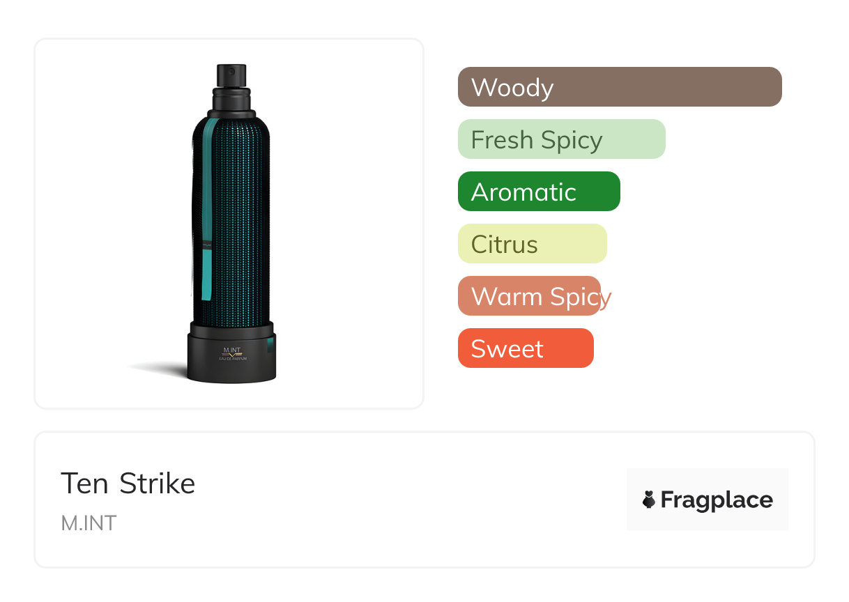 Ten Strike, from M.INT was released in 2016. The perfumer behind this creation is Jacques Flori. It has the top notes of Bergamot, Orange, Palisander Rosewood, and Pink Pepper, middle notes of Fir, Geranium, Patchouli, and White Flowers, and base notes of Benzoin, Cedarwood, Musk, and Oakmoss.