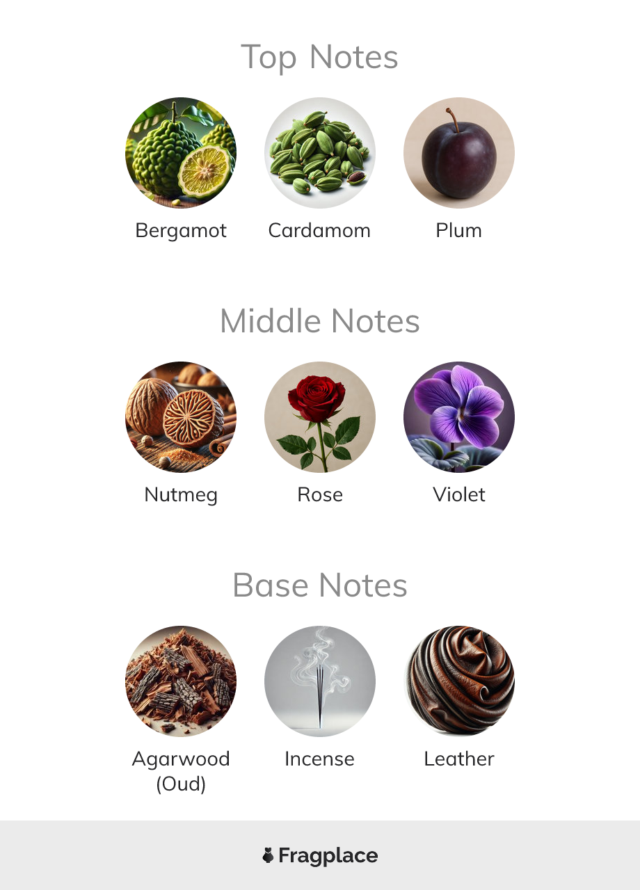 Leather, di Two Mark è stato rilasciato nel 2021. Il profumiere di questa creazione è sconosciuto. Ha le note di testa di Bergamotto, Cardamomo, and Prugna, note di cuore di Noce moscata, Rosa, and Viola, and note di fondo di Agarwood (Oud), Incenso, and Pelle.