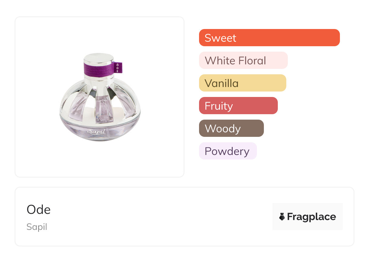 Ode, di Sapil è stato rilasciato nel 2023. Il profumiere di questa creazione è sconosciuto. Ha le note di testa di Ribes nero and Pera, note di cuore di Iris, Gelsomino, and Fiori d'arancio, and note di fondo di Patchouli, Pralina, Fagiolo Tonka, and Vaniglia.