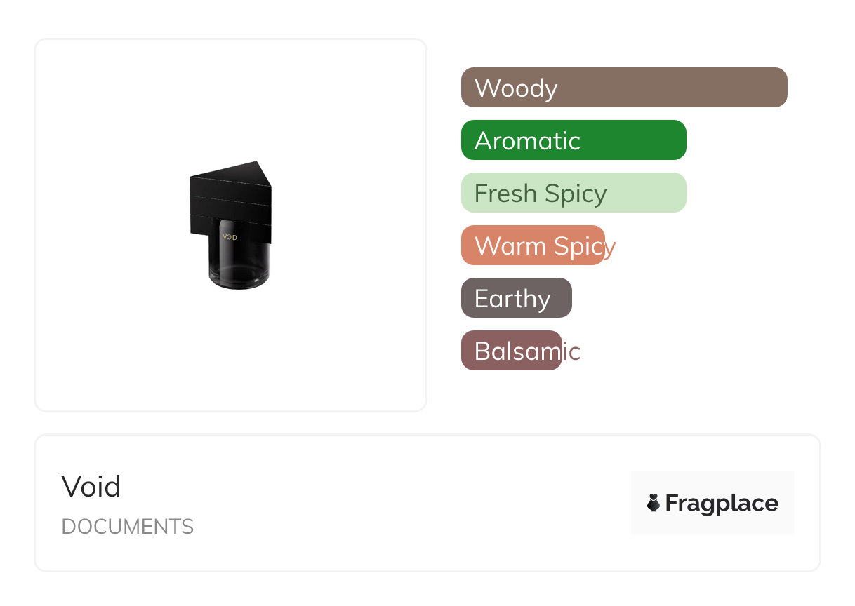 Void, di DOCUMENTS è stato rilasciato in anno sconosciuto. Il profumiere di questa creazione è sconosciuto. Ha le note di testa di Bergamotto, Noce moscata, and Pepe, note di cuore di Elemi, Patchouli, and Assenzio, and note di fondo di Legno chiaro, Legno di Guaiaco, Sandalo, and Vetiver.