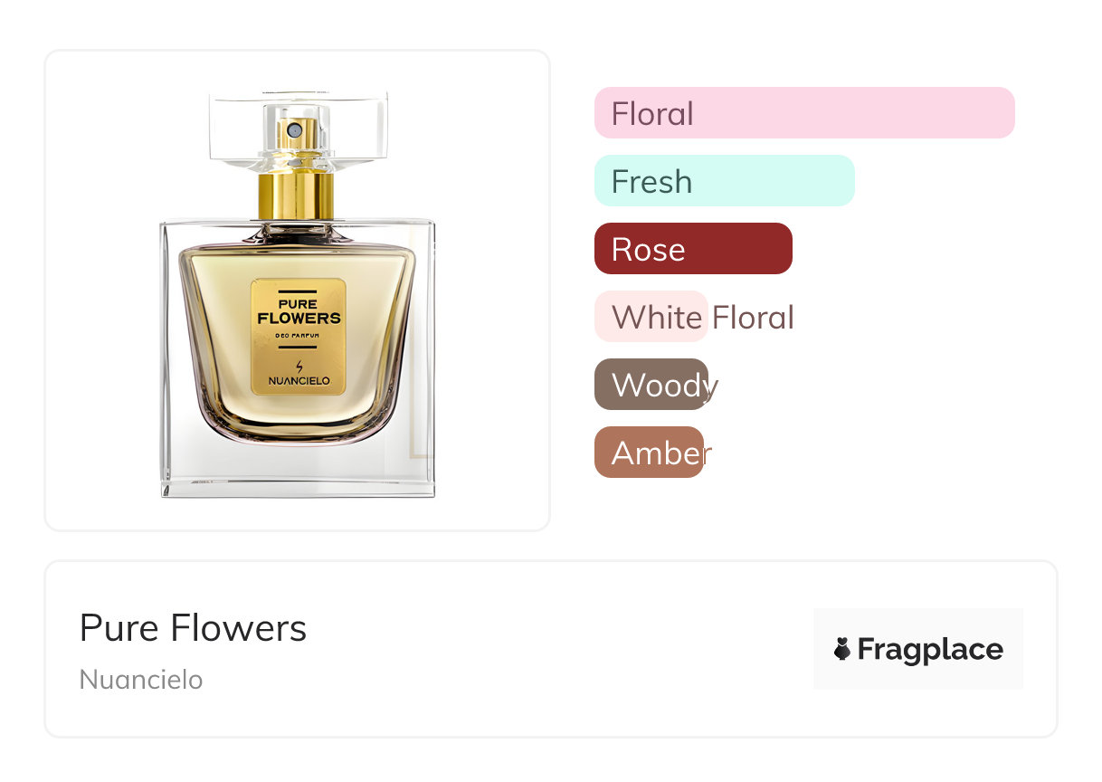Pure Flowers, di Nuancielo è stato rilasciato nel 2017. Il profumiere di questa creazione è sconosciuto. Ha le note di testa di Fresia, Litchi, and Peonia, note di cuore di Il giglio della valle, Magnolia, and Rosa, and note di fondo di Ambra and Legno di cedro.