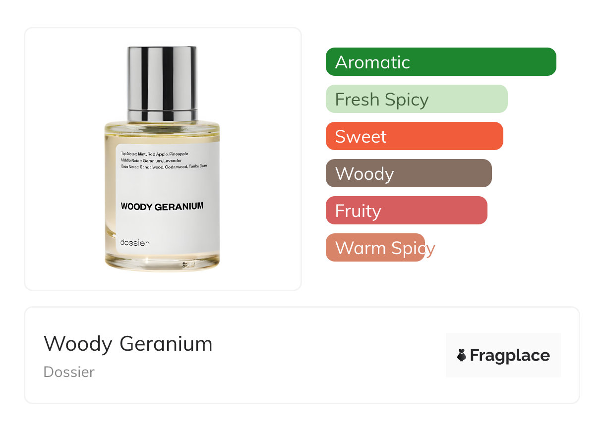 Woody Geranium, di Dossier è stato rilasciato nel 2021. Il profumiere di questa creazione è sconosciuto. Ha le note di testa di Menta, Ananas, and Mela rossa, note di cuore di Geranio and Lavanda, and note di fondo di Legno di cedro, Sandalo, and Fagiolo Tonka.