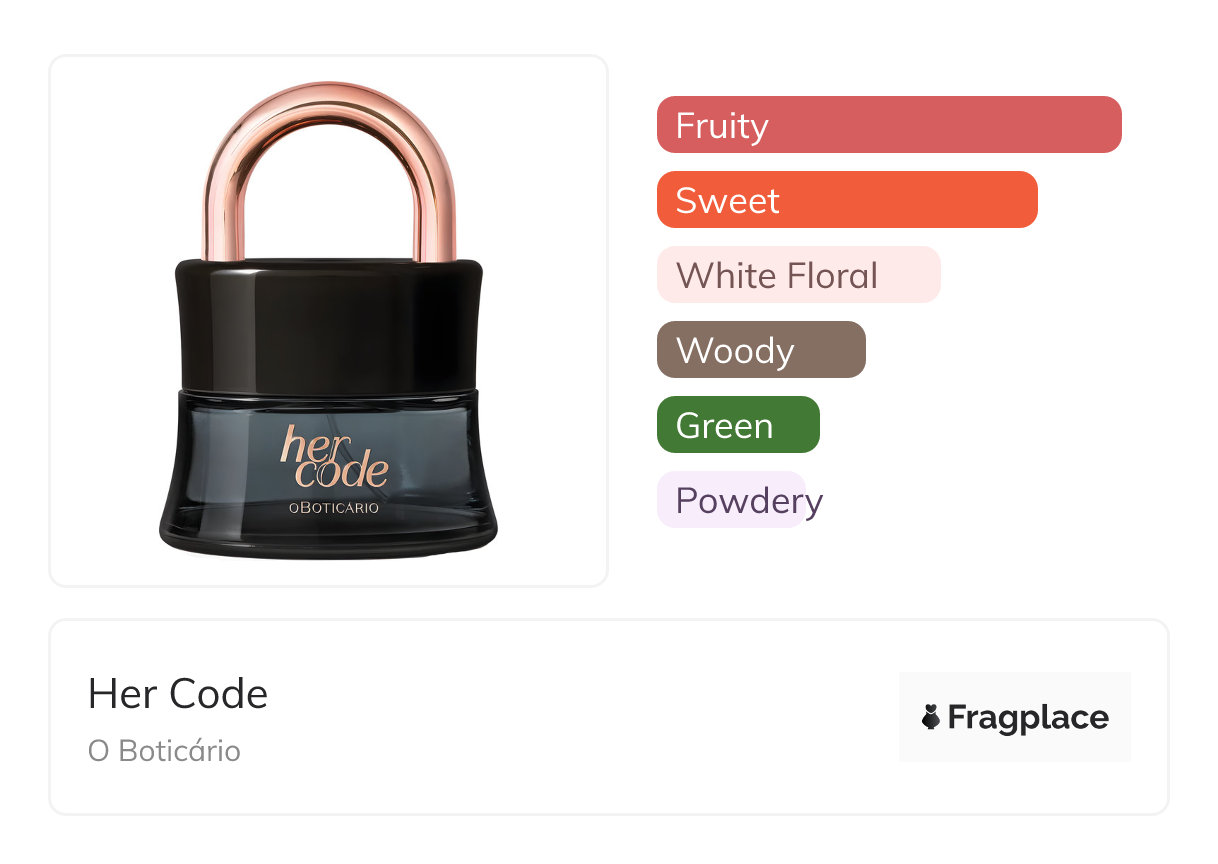 Her Code, di O Boticário è stato rilasciato nel 2023. Il profumiere di questa creazione è Louise Turner. Ha le note di testa di Mirtillo nero, Ciliegia, Foglie e germogli di ribes, Pesca, and Vino rosso, note di cuore di Gelsomino, Liquori, and Tuberosa, and note di fondo di Ambra, Accordo gourmand, and Sandalo.