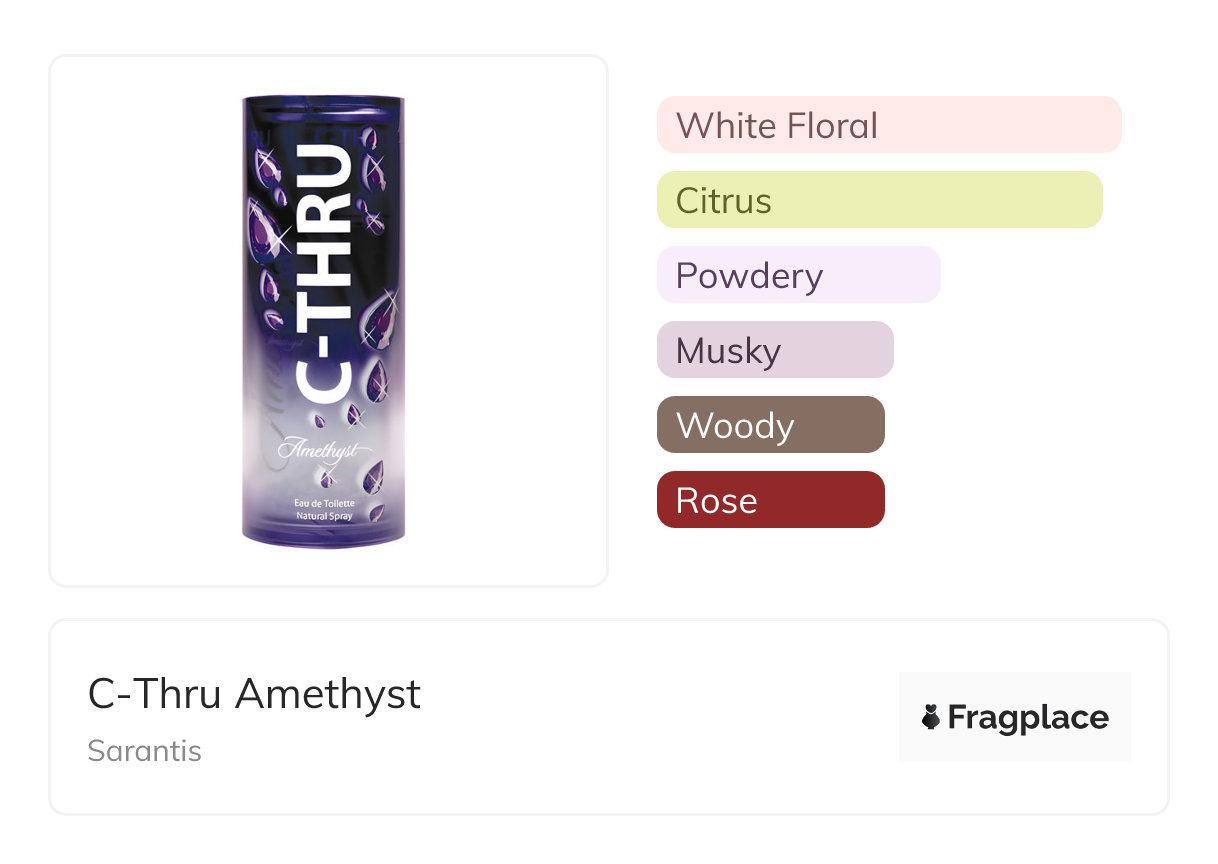 C-Thru Amethyst, di Sarantis è stato rilasciato in anno sconosciuto. Il profumiere di questa creazione è sconosciuto. Ha le note di testa di Bergamotto and Arancia mandarino, note di cuore di Gelsomino, Il giglio della valle, and Rosa, and note di fondo di Ambra, Muschio, and Sandalo.