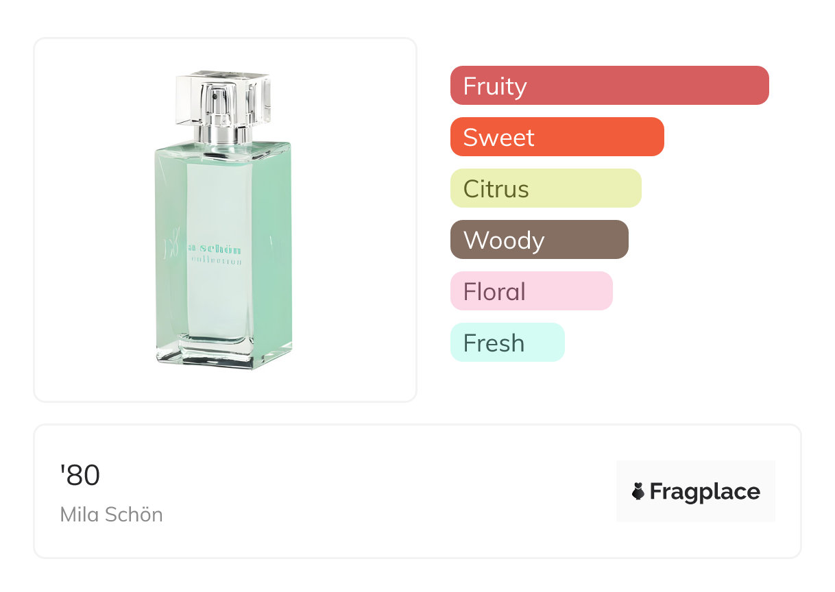 '80, from Mila Schön was released at unknown year. The perfumer behind this creation is unknown. It has the top notes of Bergamot, Peach, Red Apple, Red Currant, and Tangerine, middle notes of Freesia, Jasmine, and Rose, and base notes of Amber, Cedarwood, Musk, and Patchouli.