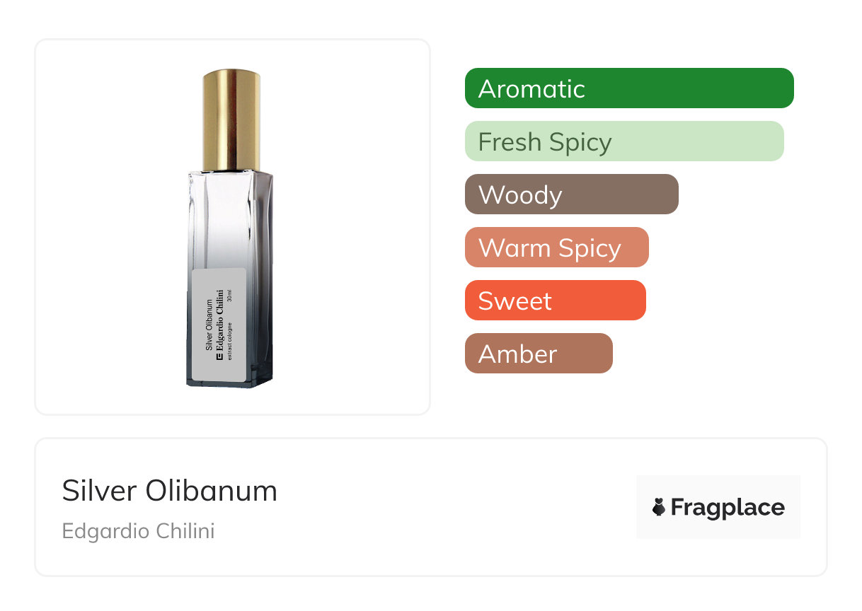 Edgardio ChiliniのSilver Olibanumは2012年にリリースされました。 この作品を手がけた調香師はSergey Karovです。 アーモンド, アマレット, アンジェリカ, バジル, ベイリーフ, ベルガモット, デイジー, ディル, エンシアン, ガランガ, クチナシ, ゼラニウム, ジンジャー, ハニー, レモンバーム, マンダリンオレンジ, ミント, ネロリ, ナイジェラ, オレンジ, パピルス, ペッパー, プチグレイン, パイナップル, ローズマリー, セージ, and タイムのトップノート, アルテミシア, バーチ・タール, カルダモン, クローブ, スグリの葉と蕾, モミ, ゼラニウム, アイリス, ジャスミン, ラベンダー, マートル, ナツメグ, ピンクペッパー, ローズ, and サフランのミドルノート, and 沈香(ウード), アンバー, ベンゾイン, キャラメル, カシミアウッド, カストレアム, シダーウッド, ダークチョコレート, ラブダナム, レザー, マスク, オークモス, オリバナム(乳香), パチョリ, 松の木, サンダルウッド, スタイラックス, タバコ, トル・バルサム, トンカ豆, バニラ, and ベチバーのベースノートを持っています。