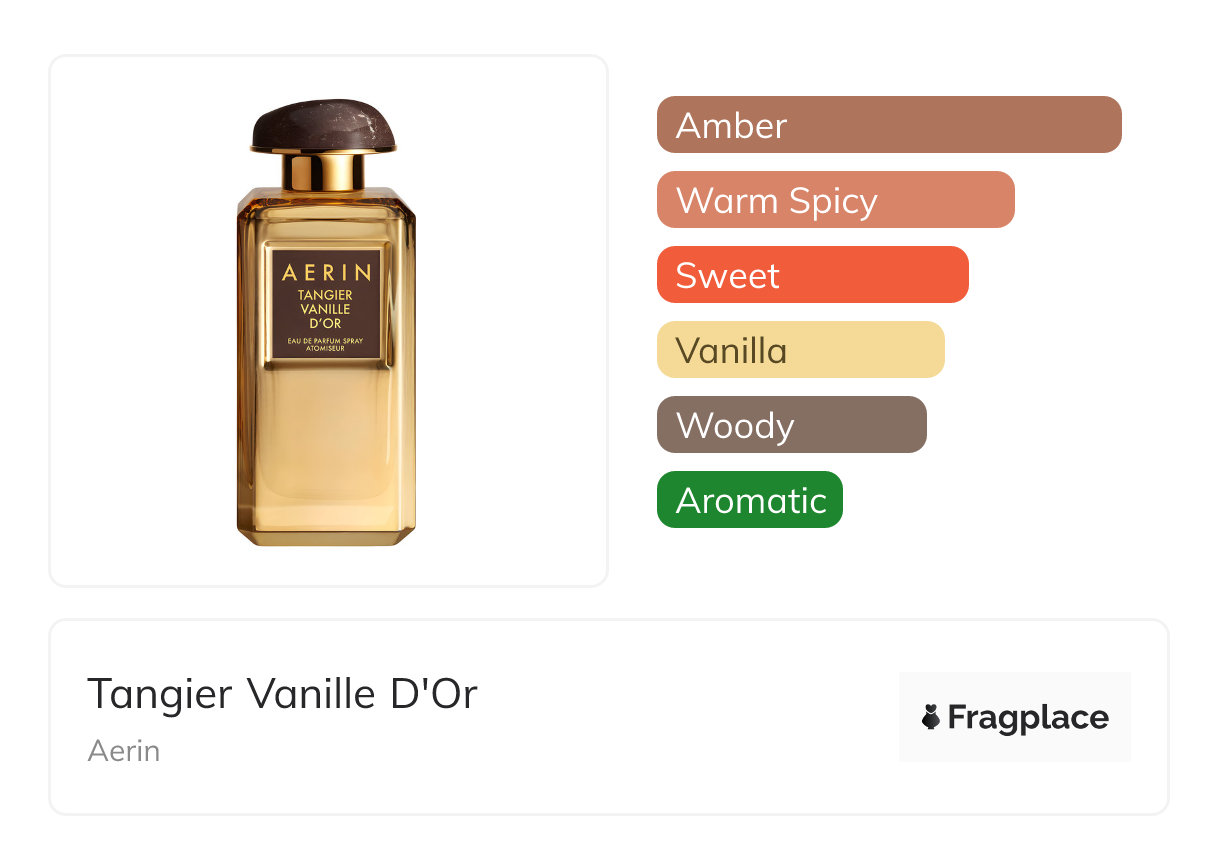 Tangier Vanille D'Or od Aerin zostały wydane w 2017 roku. Perfumiarzem tej kreacji jest nieznany. Zawiera nuty głowy: Bergamotka, Śliwka, and Róża, nuty serca: Mirra, Szafran, and Wanilia, and nuty bazy: Bursztyn, Drewno kaszmirowe, Drzewo sandałowe, and Tonka Bean.