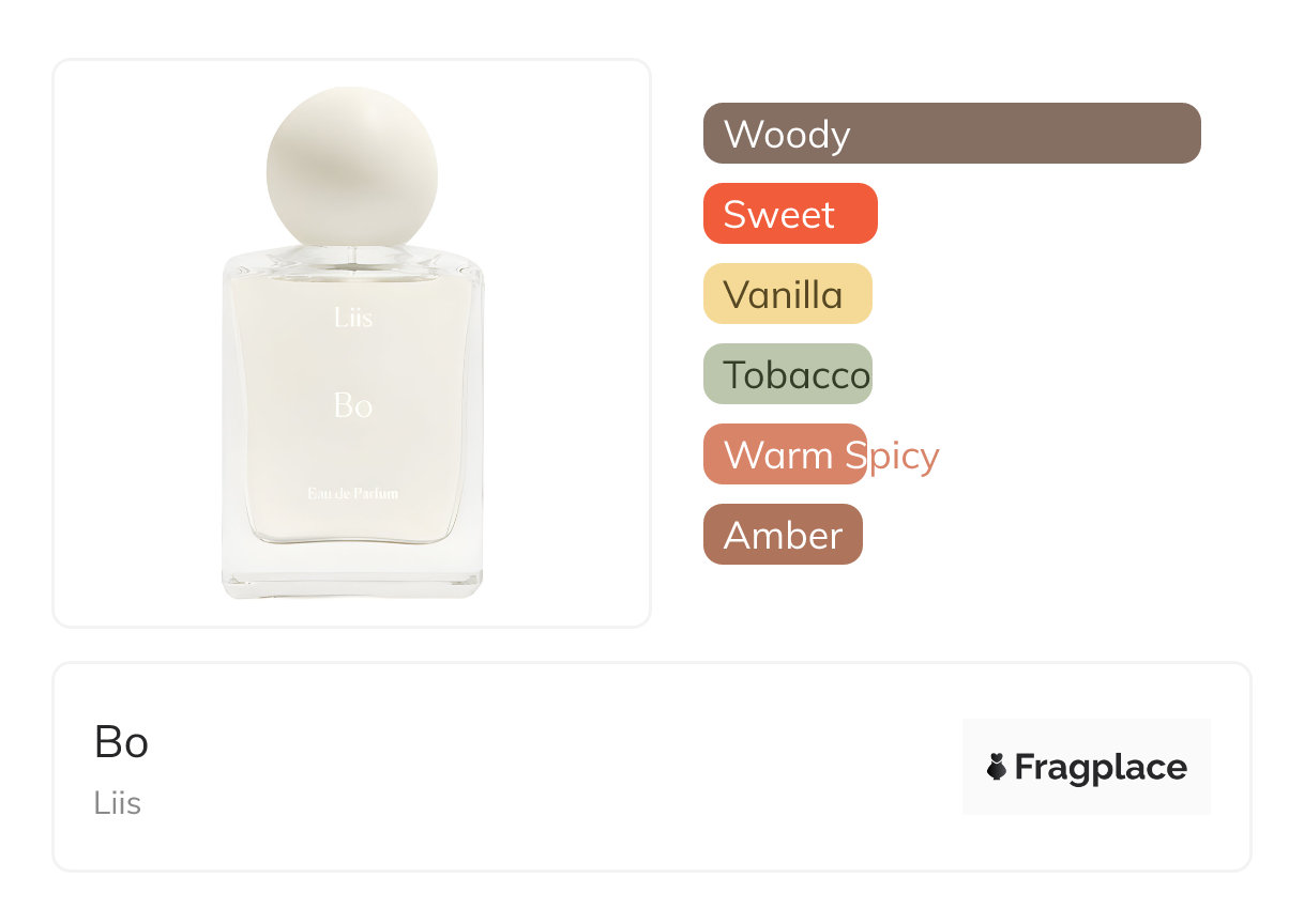 Bo od Liis zostały wydane w 2020 roku. Perfumiarzem tej kreacji jest Alissa Sullivan and Leslie Hendin. Zawiera nuty głowy: Elemi and Tytoń, nuty serca: Olibanum (kadzidło) and Sekwoja, and nuty bazy: Drzewo cedrowe, Drewno Guaiac, and Wanilia.