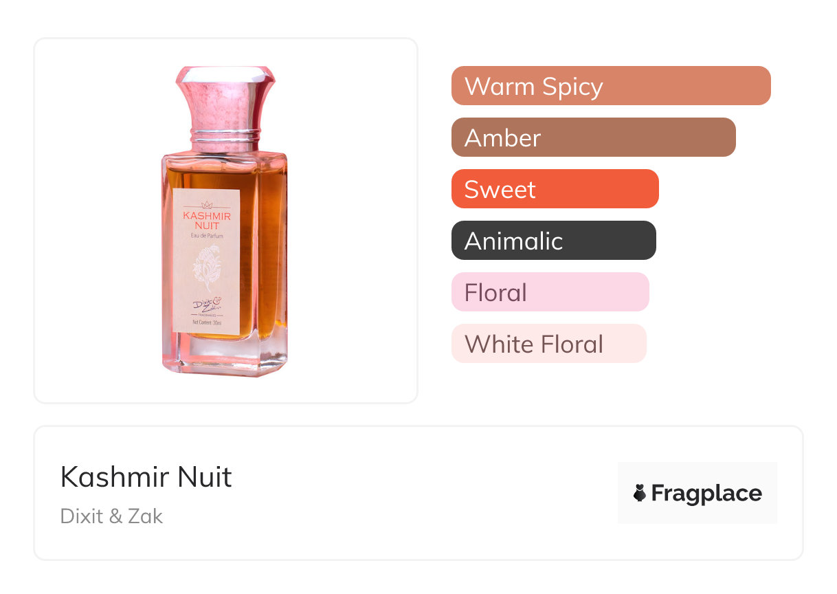 Kashmir Nuit od Dixit & Zak zostały wydane w 2020 roku. Perfumiarzem tej kreacji jest Nitish Dixit and Zakir Laskar. Zawiera nuty głowy: Bergamotka, Grejpfrut, Jaśmin, and Róża, nuty serca: Kardamon, Cynamon, Jaśmin, Narcyz, Osmanthus, Róża, and Tuberoza, and nuty bazy: Bursztyn, Ambergris, Choya Nakh, Cyweta, Indyjski Oud, Piżmo, Oakmoss, Olibanum (kadzidło), Opoponax, Pandanus, Paczula, Szafran, Drzewo sandałowe, Thailand Oud, Tytoń, Tonka Bean, and Wanilia.