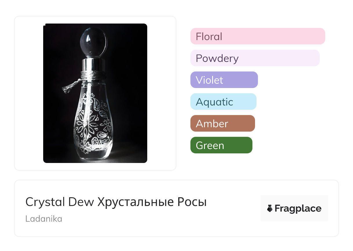 Crystal Dew Хрустальные Росы, da Ladanika foi lançado em 2017. O perfumista por trás desta criação é Yana Andreeva. Possui as notas de saída de Bergamota, Notas verdes, Espinheiro-alvar, Folha de violeta, and Água, notas de coração de Aldeídos, Íris, Jasmim, Mimosa, and Violeta, and notas de fundo de Ambrette (Malva almiscarada), Benjoim, Heliotrópio, and Styrax.