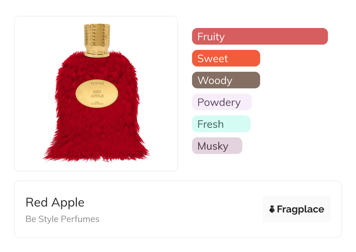 Red Apple, da Be Style Perfumes foi lançado em 2018. O perfumista por trás desta criação é desconhecido. Possui as notas de saída de Groselha preta, Citrinos, and Maçã vermelha, notas de coração de Jasmim and Rosa, and notas de fundo de Almíscar, Framboesa, and Sândalo.